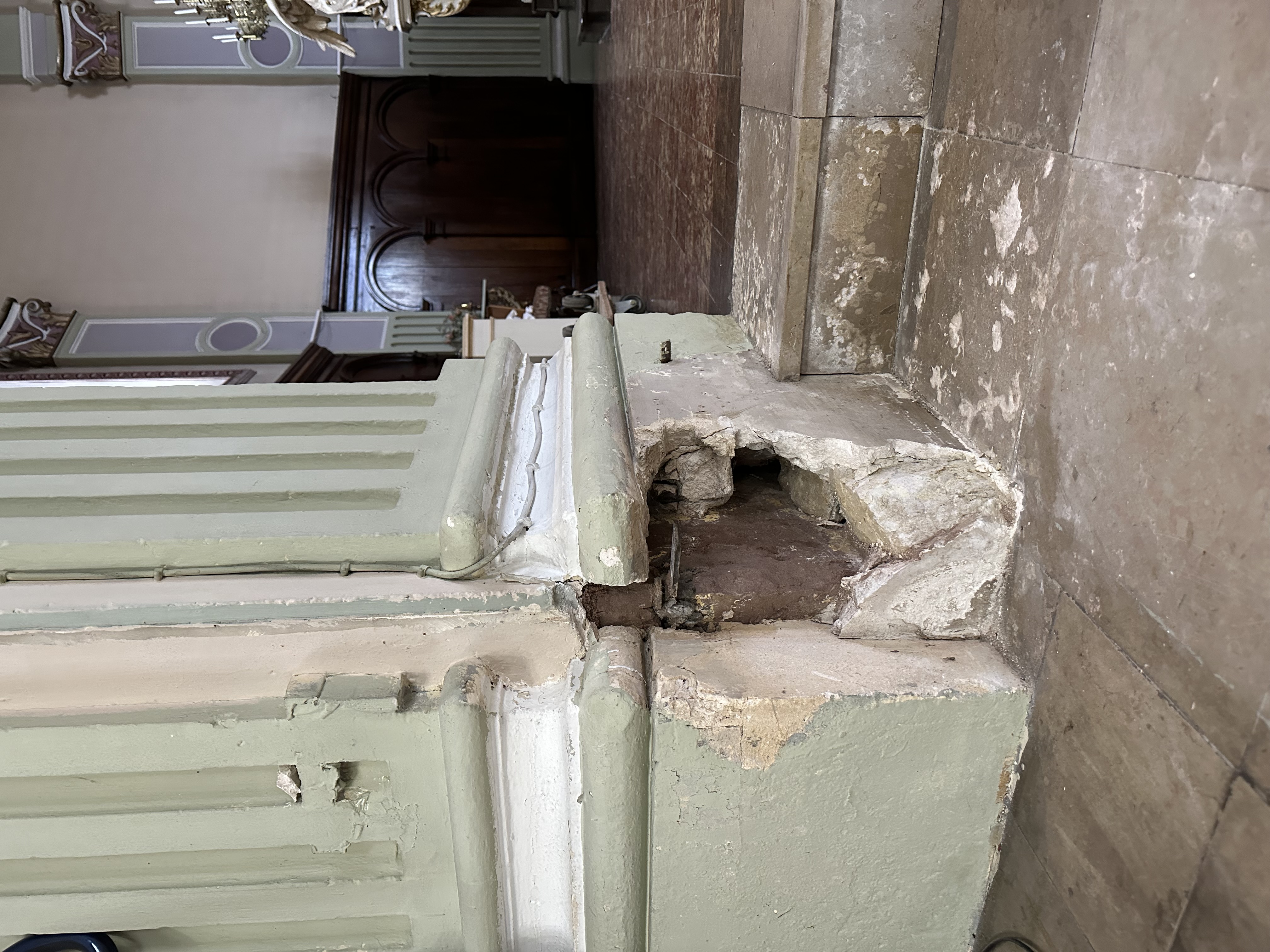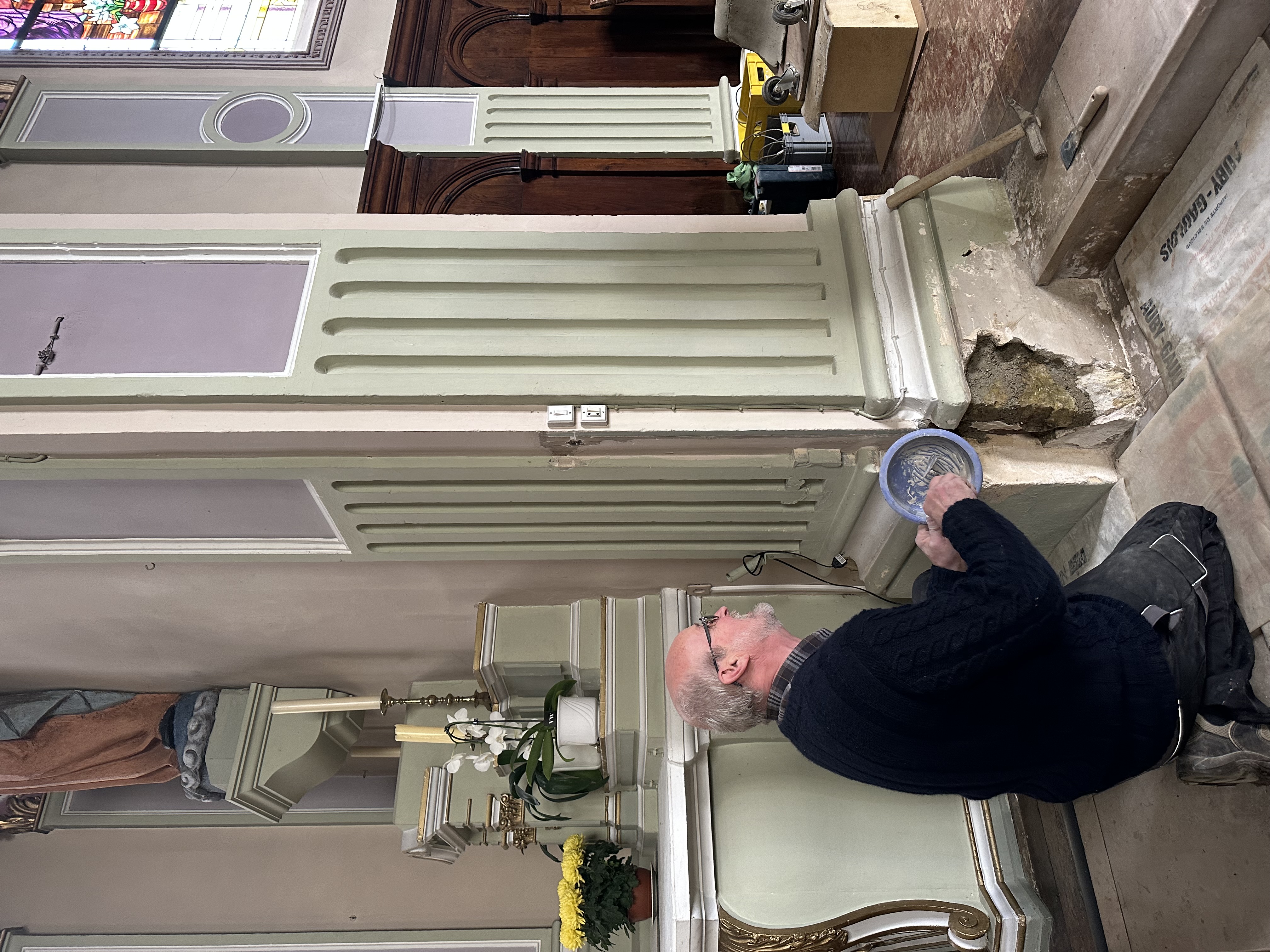 9 novembre 2022 : mur où était encastré l’ancien ambon avant et après la réparation effectuée par Toun.