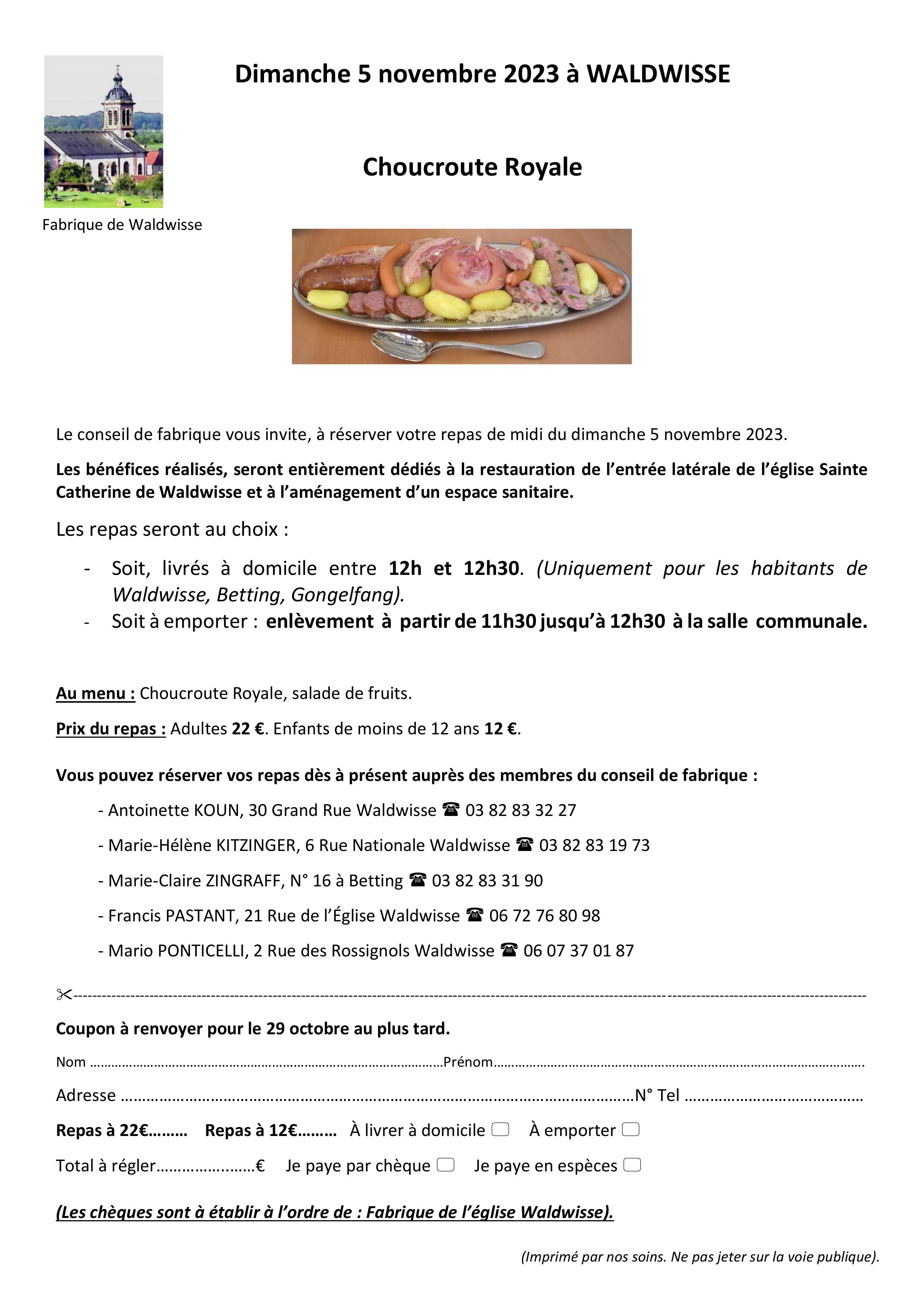 En plus de savourer une excellente choucroute royale, vous avez l’opportunité de soutenir l’aménagement d’un espace sanitaire dans l’église Sainte Catherine de WALDWISSE.