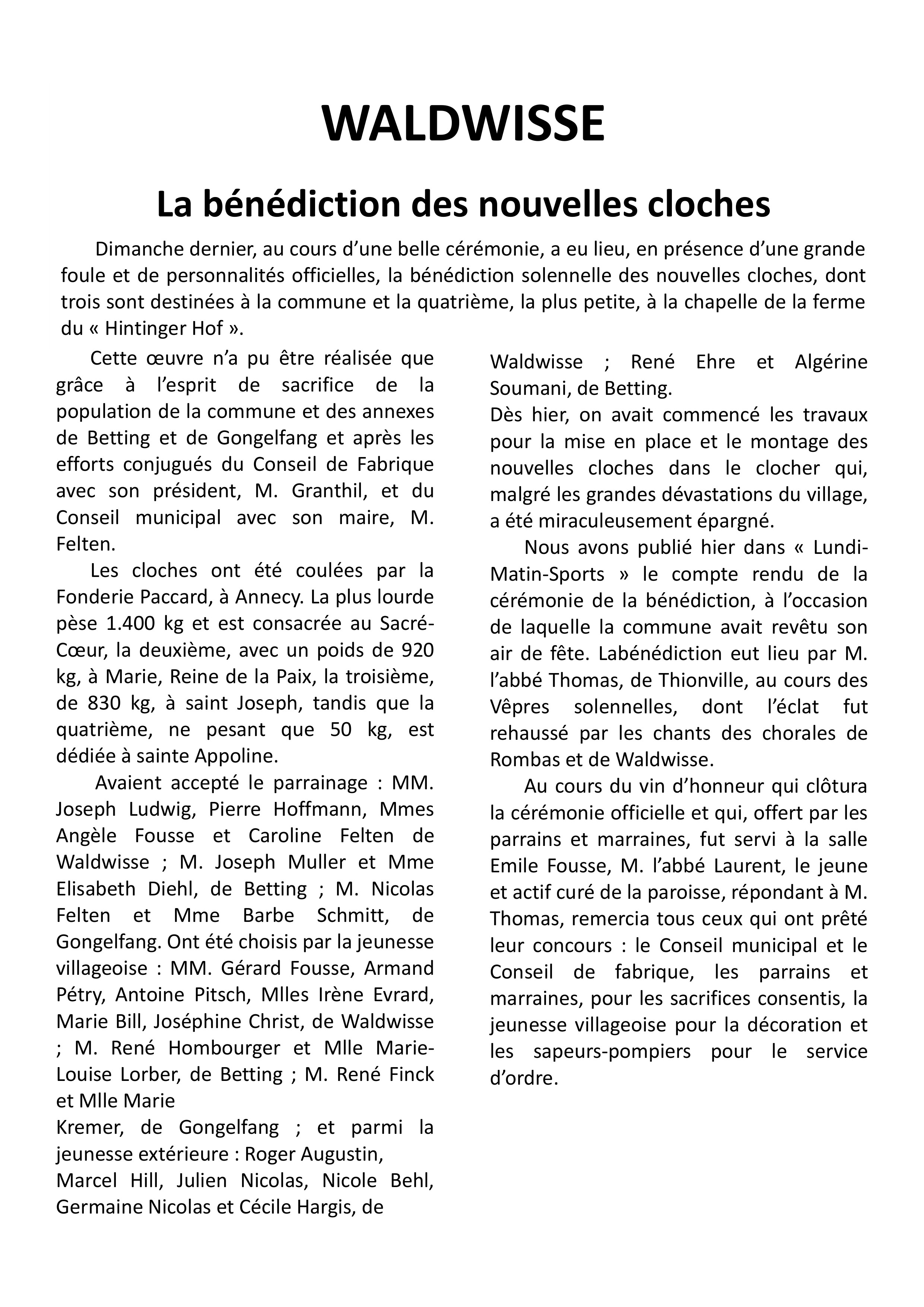 À la mi-carême 1923, trois cloches nouvelles ornent l’avant-chœur de l’église. Une fois encore de nombreux prêtres entouraient Monsieur l’Abbé Oster, Supérieur du Grand Séminaire, et un enfant du pays, l’abbé Wender, archiprêtre de Moyeuvre-Grande, le prédicateur, à la grande satisfaction des paroissiens et de leur curé, l’abbé Bolzinger. Pour lui, cette bénédiction des cloches fut une des journées les plus mémorables empreintes de foi vivante qu’il put offrir à Waldwisse.