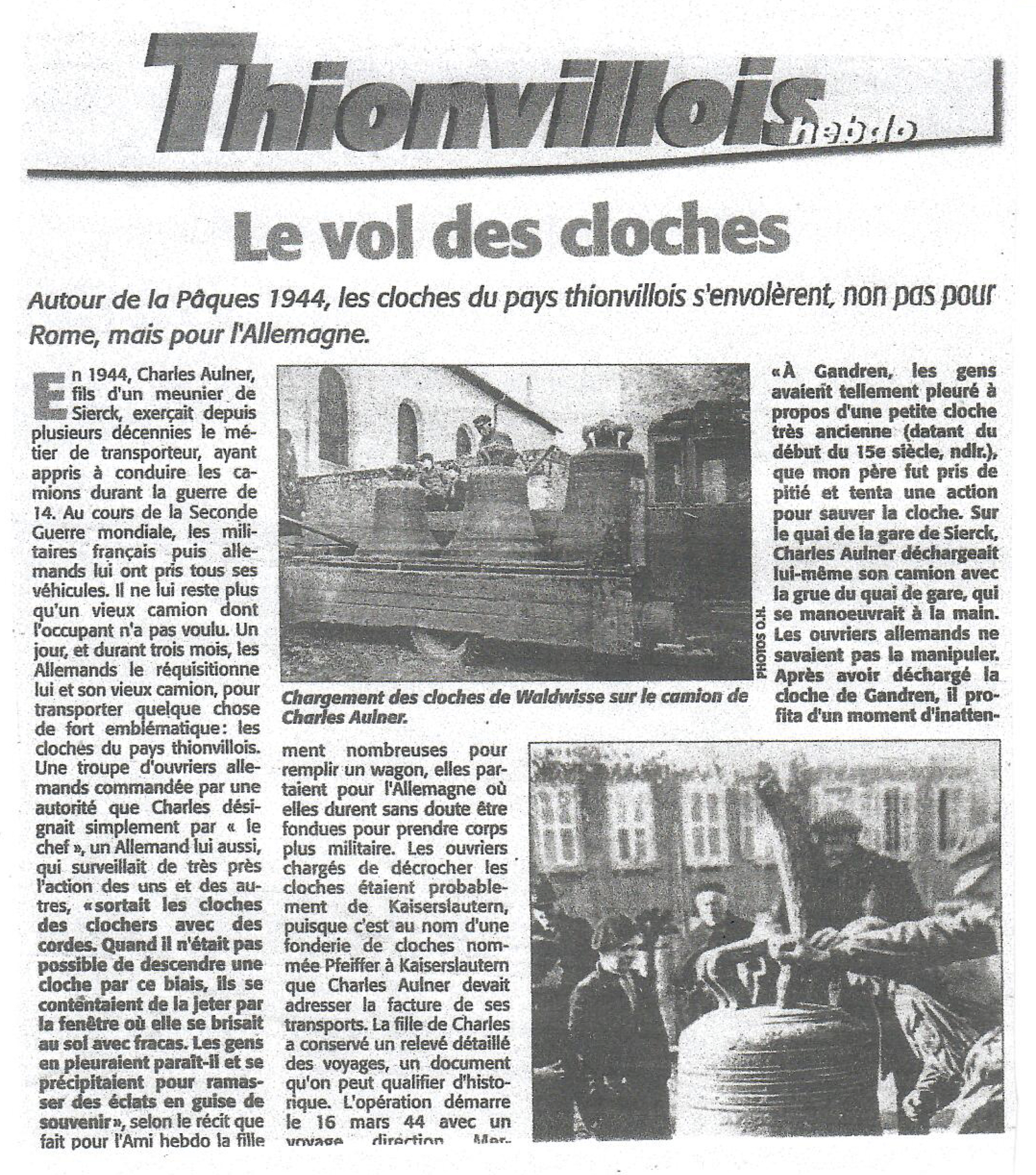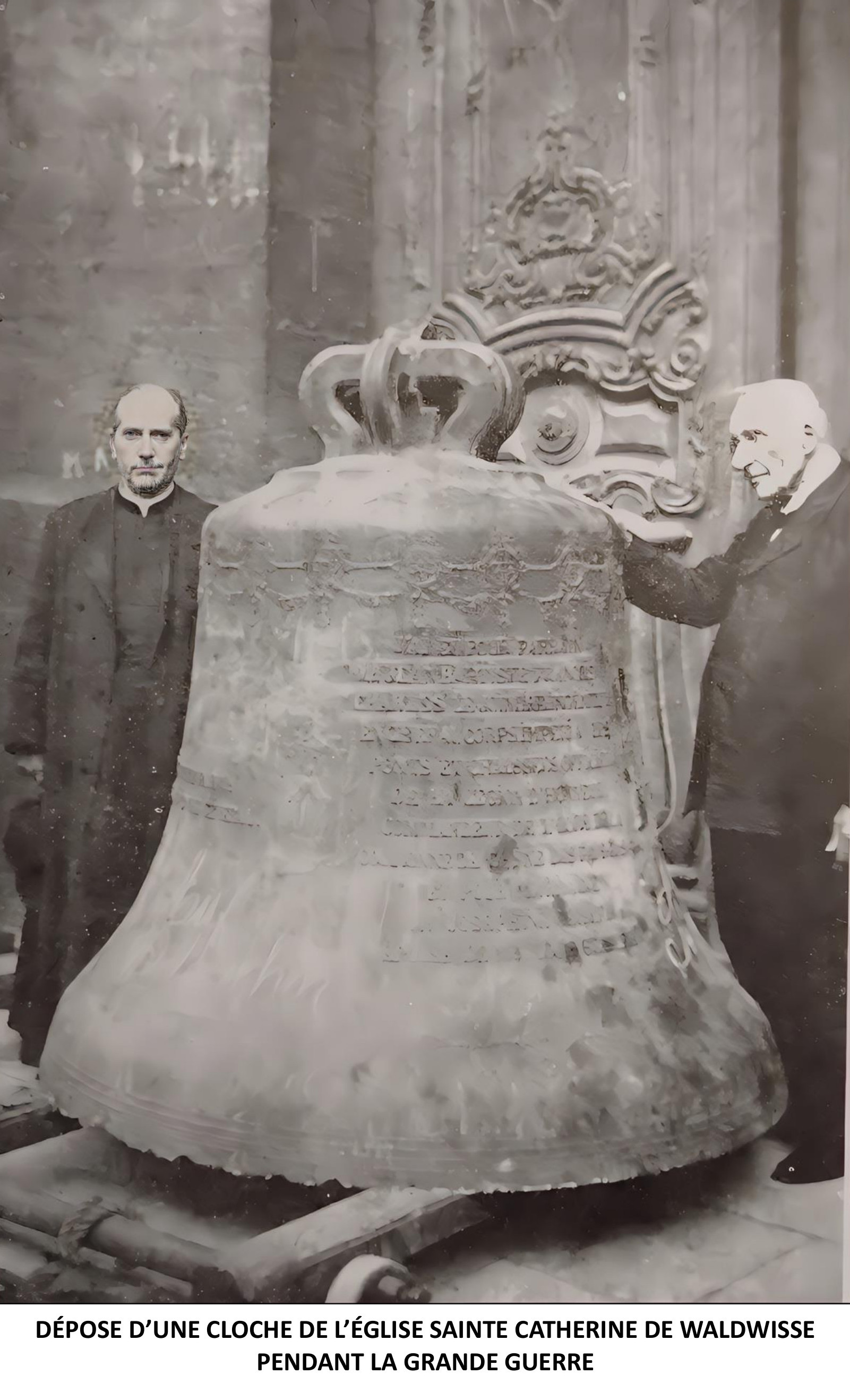 desservant les villages du canton et des environs, l’abbé Masson étant curé de la paroisse. À peine quatre années plus tard, par une belle matinée de printemps, trois cloches furent descendues, confisquées et partirent pour la fonte. Resta celle baptisée du nom du Cœur sacré de Jésus ; les trois autres prirent le chemin de l’Allemagne peu de jours avant l’armistice « par suite de l’intervention directe du sous-préfet de Thionville-Est qui s’était laissé influencer par un instituteur allemand (Lücking) hostile au curé. Quand celui-ci obtint enfin la permission de faire un voyage en Allemagne pour s’informer du sort de ses cloches, c’était trop tard ; elles venaient d’être brisées dans la fonderie de Call dans l’Eifel, ainsi que l’atteste le calepin de la fonderie » (Bour).