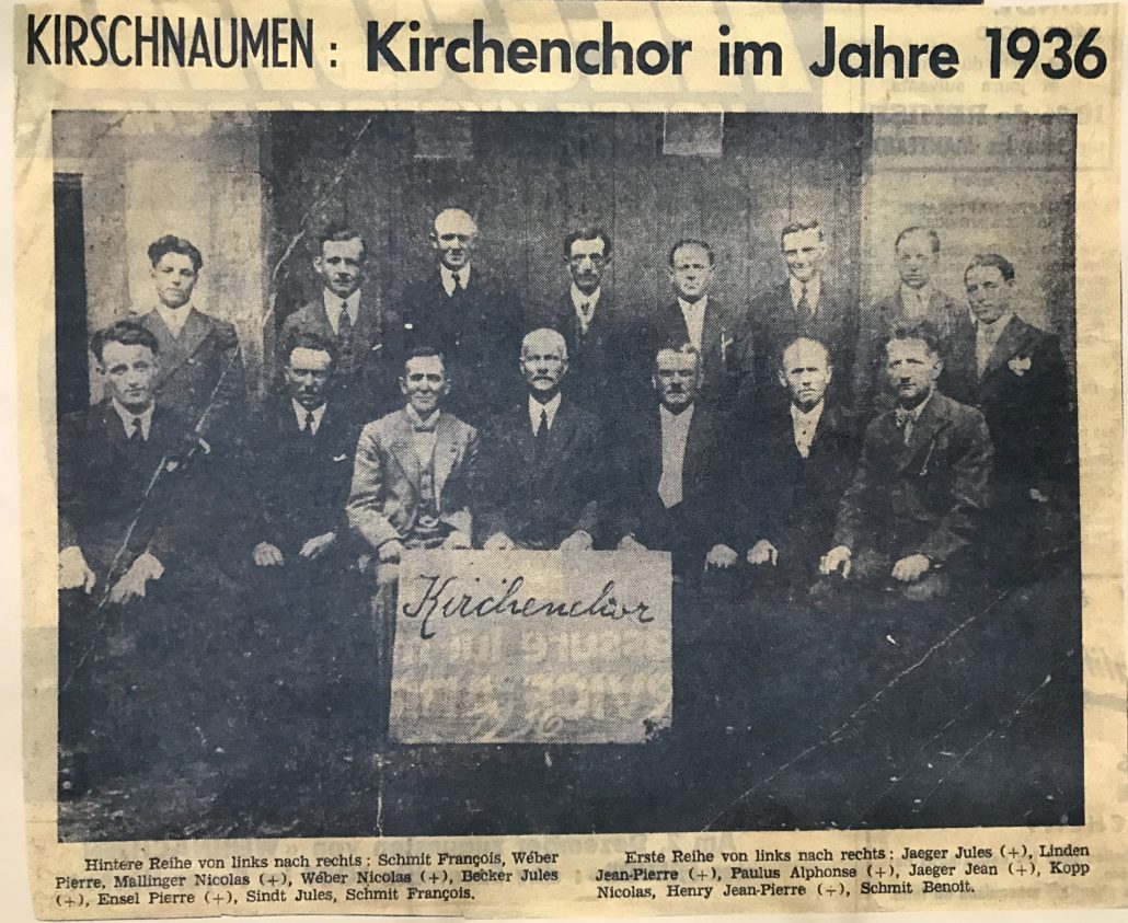Chorale de Kirschnaumen 1936 1er rang: F. Schmitt, P. Weber, N. Mallinger, N. Weber, J. Becker, P. Ensel, Jules Sindt, Fr. Schmitt 2eme rang: Jules jaeger, J.P. Linden, Alp. Paulus, N; Kopp, J.p. Henry B. Schmitt J. Jaeger.
