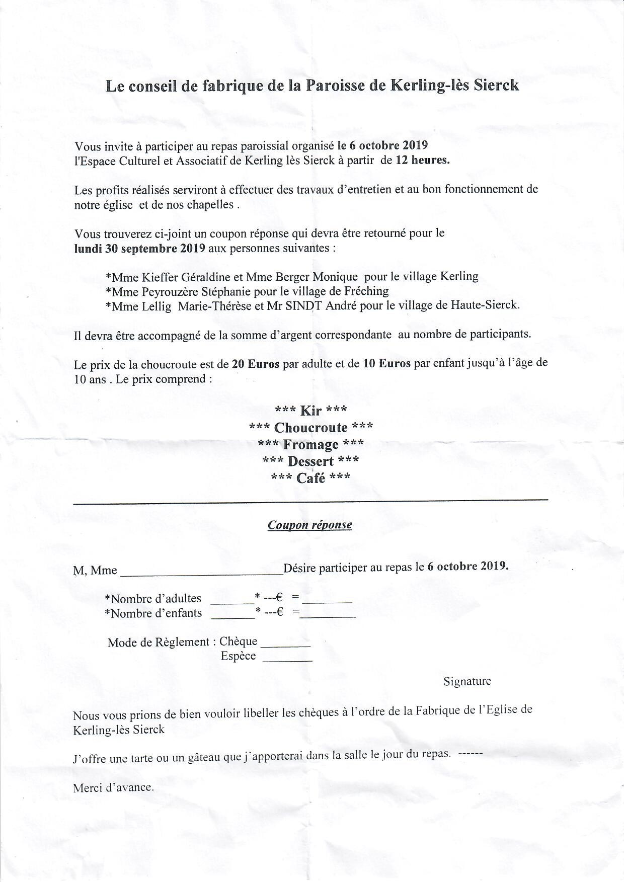 Vous êtes ici : Accueil / Actualité / Actualités / Repas paroissial à KERLING : Samedi 6 Octobre à partir de 12 h
