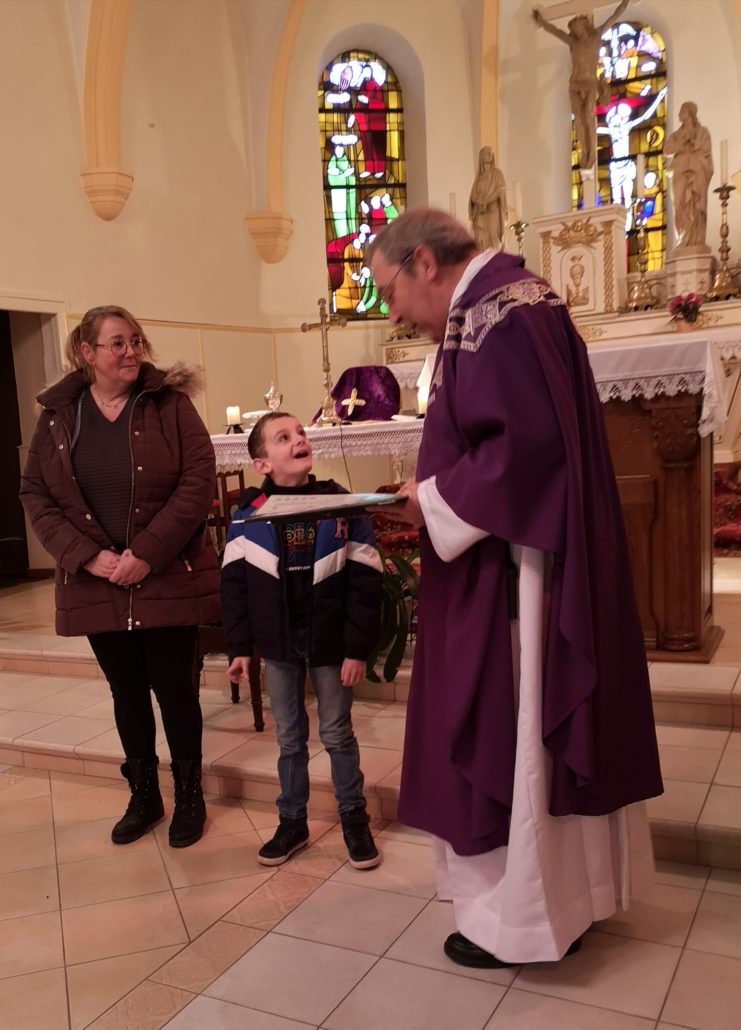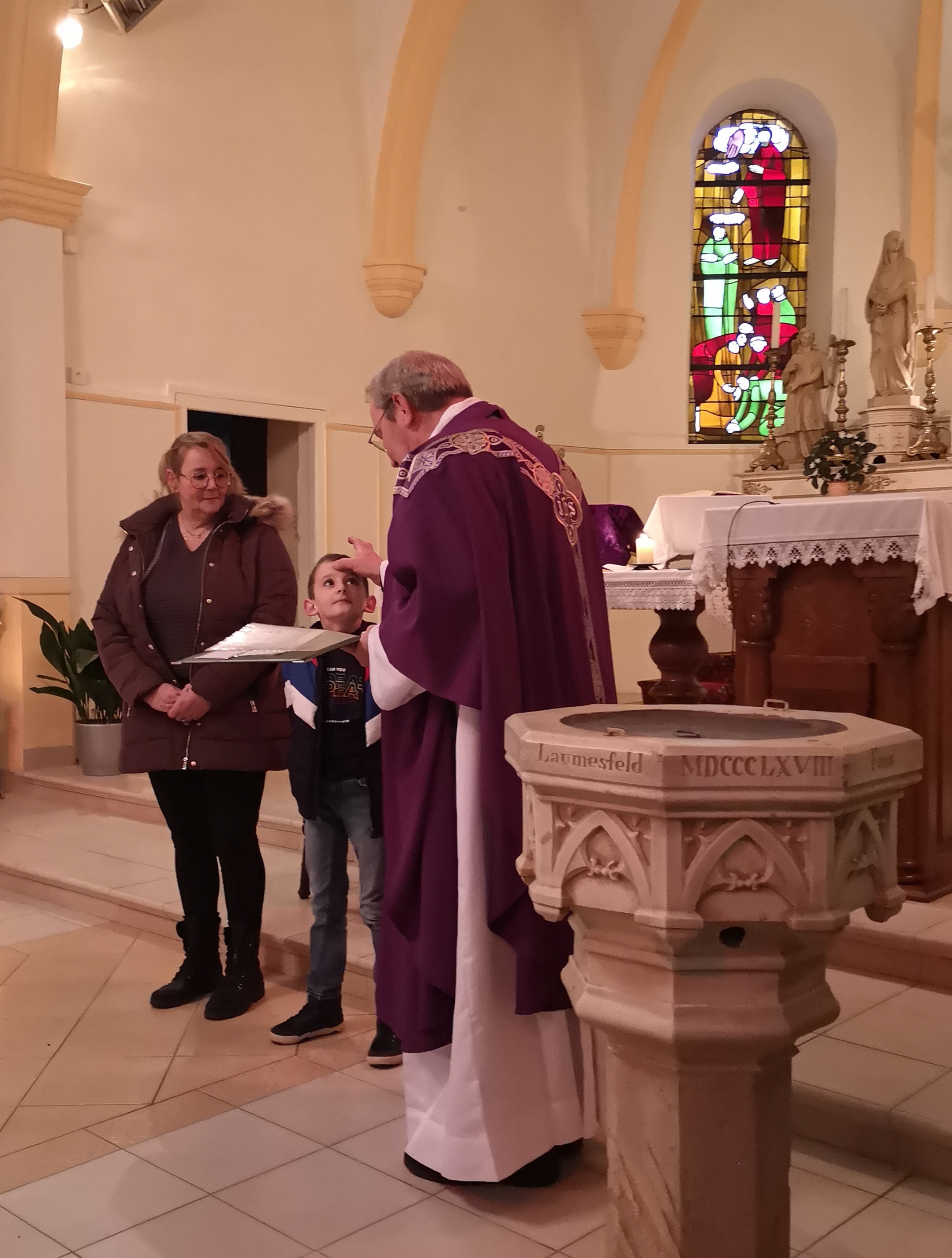 Voici quelques photos de l’accueil en Église de Lucas, pour la première étape de sa marche vers le baptême, lors de la messe dominicale à Laumesfeld. Evelyne, sa catéchiste de première communion, était présente également.