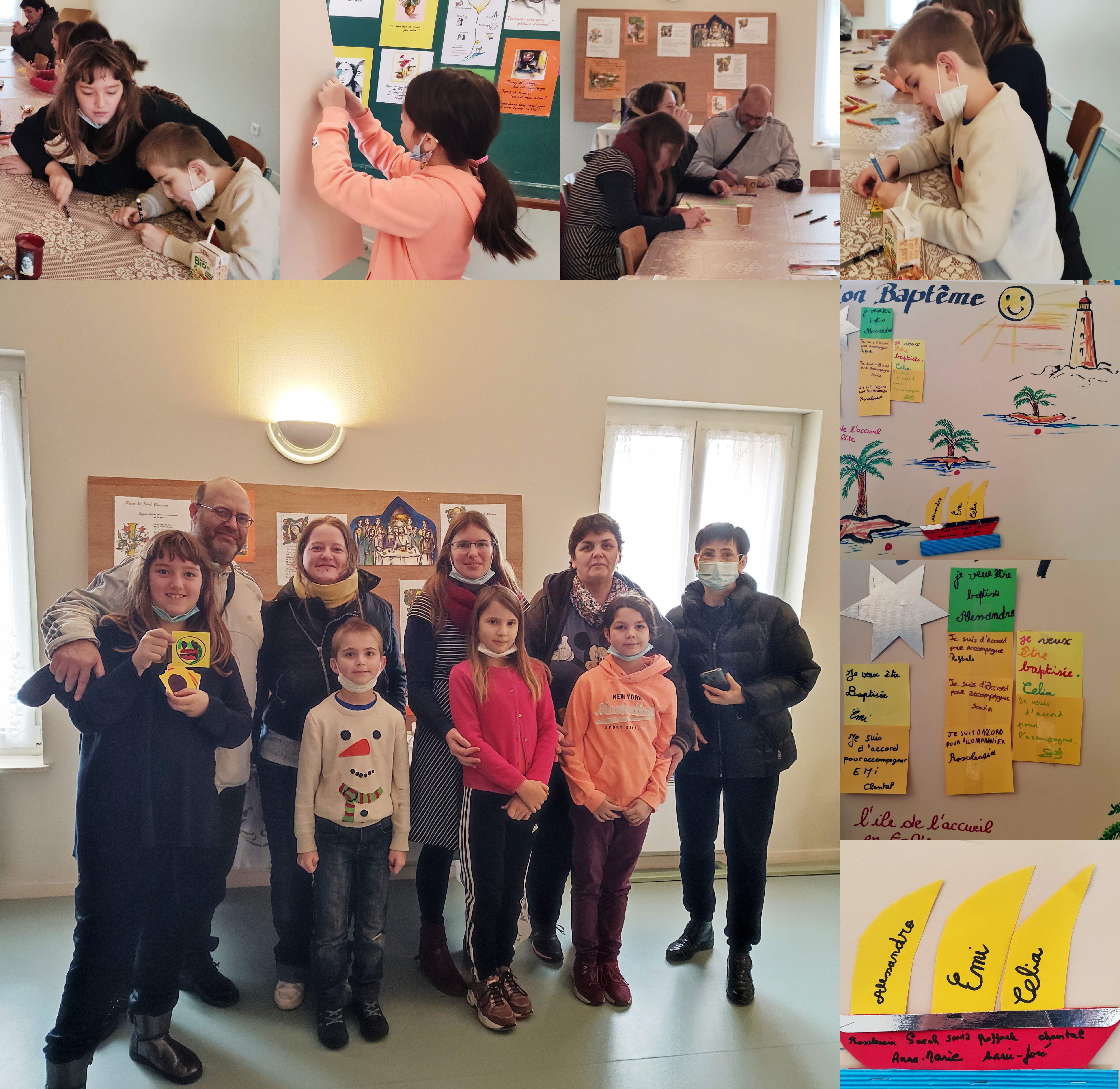 Première rencontre de préparation au baptême pour les trois enfants en âge scolaire de notre communauté et leurs familles. EMI, Celia et Alessandro ont découvert l’Eglise qui va les accueillir bientôt, et Jésus Christ, l’Ami qui va se donner à eux avec joie. Un grand merci aux »grands » pour leur participation active et joyeuse . Nous partons ensemble pour un beau voyage ! Rendez vous le 19 décembre à 10h, pour l’accueil en Église , lors de la messe dominicale à Flastroff.