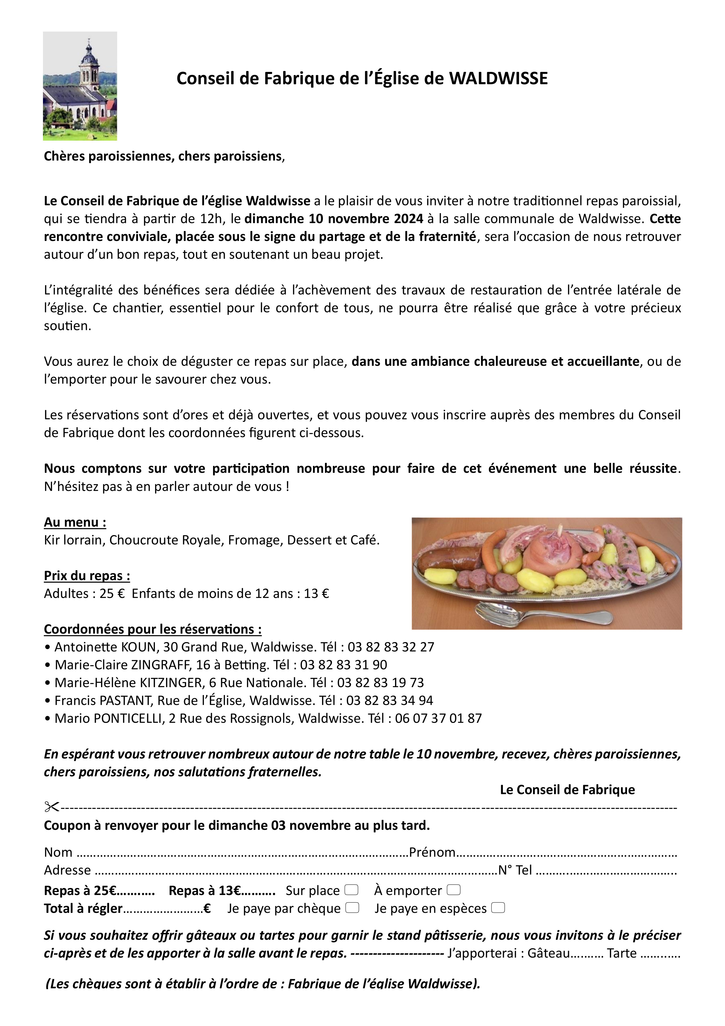 • Dimanche 9 novembre à WALDWISSE : Repas paroissial17 octobre 2025 - 15 h 00 min