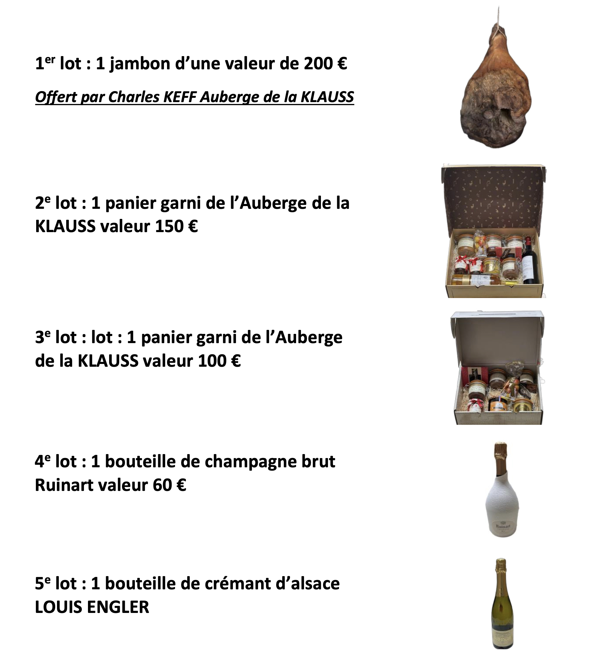 Les billets sont vendus au prix de 2 € l’unité, 10 € pour 6, avec de magnifiques lots à gagner, dont un superbe jambon d’une valeur de 200 € généreusement offert par Monsieur Charles KEFF, patron de l’Auberge de la KLAUSS de Montenach
