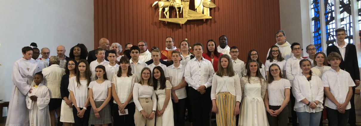 Ce samedi 8 juin, veille de la Pentecôte, l’abbé Jean-Christophe Meyer, vicaire général, a donné le sacrement de la confirmation à 26 jeunes et 6 adultes des communautés de paroisses des Archiprêtré de Sierck et d’Hettange-Grande, lors d’une messe à l’église de Roussy le village,