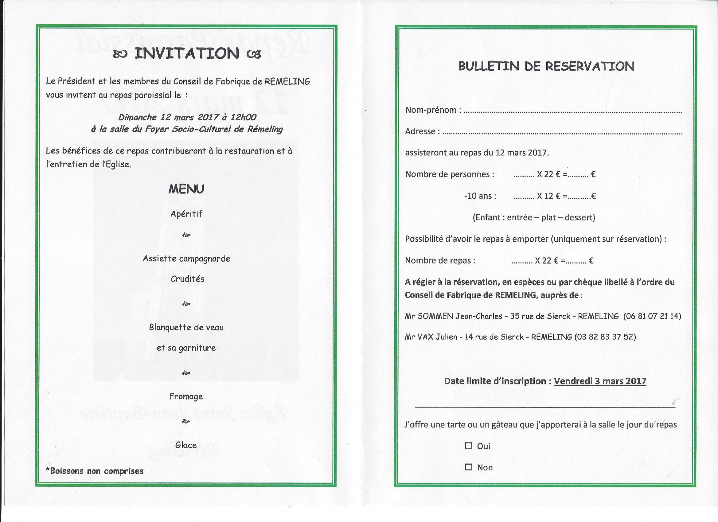 Le président et les membres du Conseil de Fabrique de REMELING vous invitent au repas paroissial le : Dimanche 12 mars 2017 à 12h à la salle du Foyer Socio-Culturel de Rémeling.