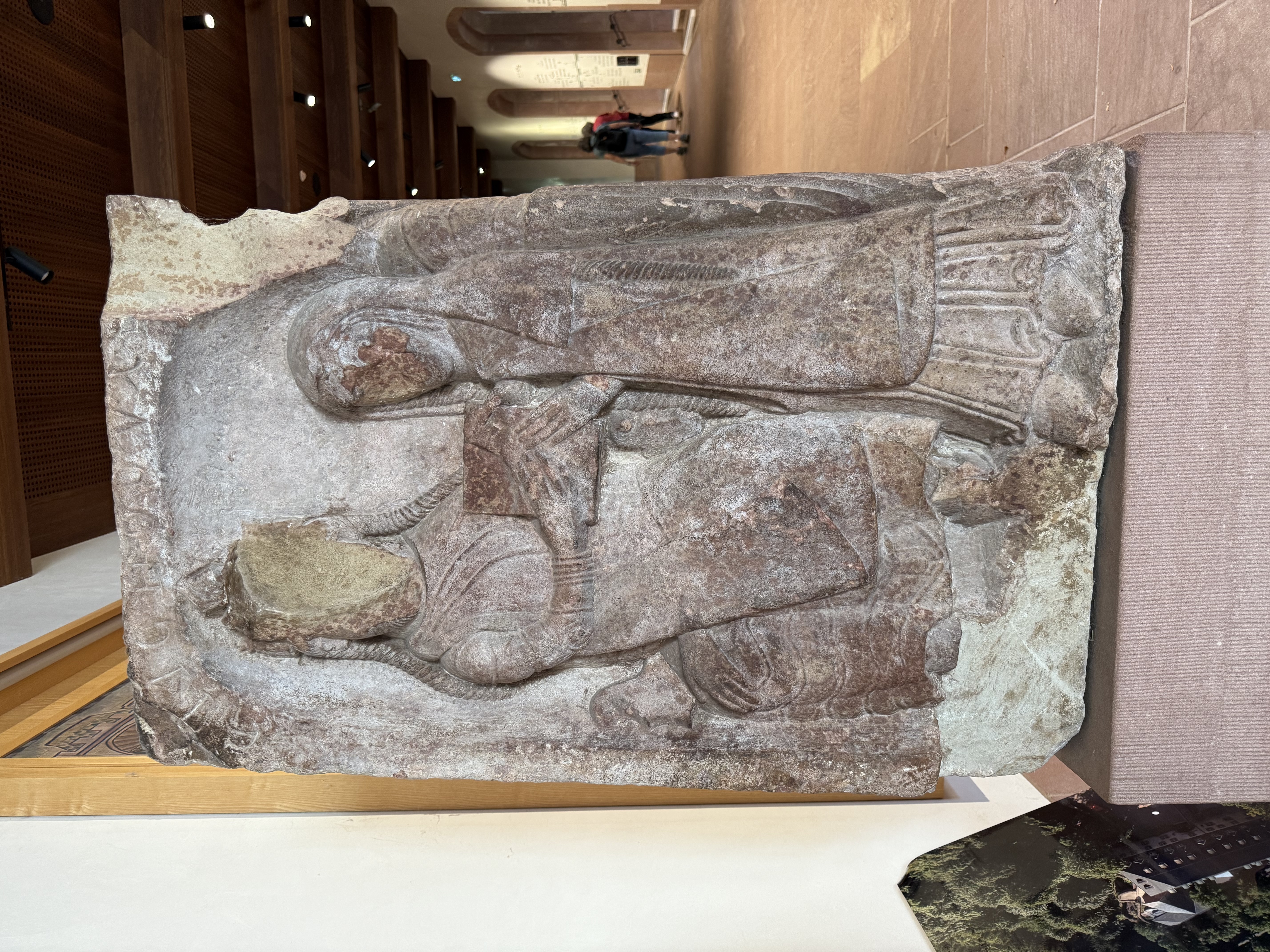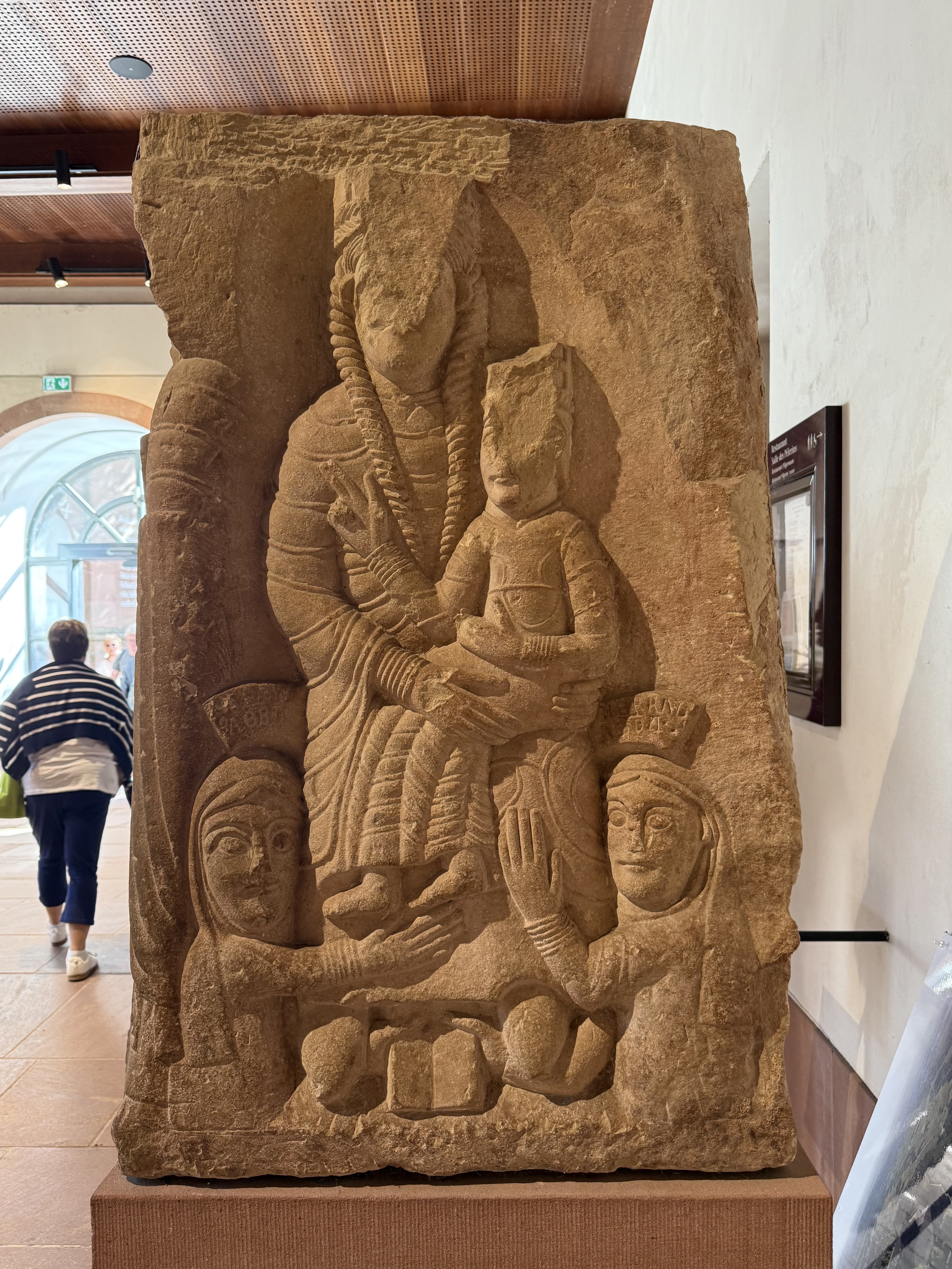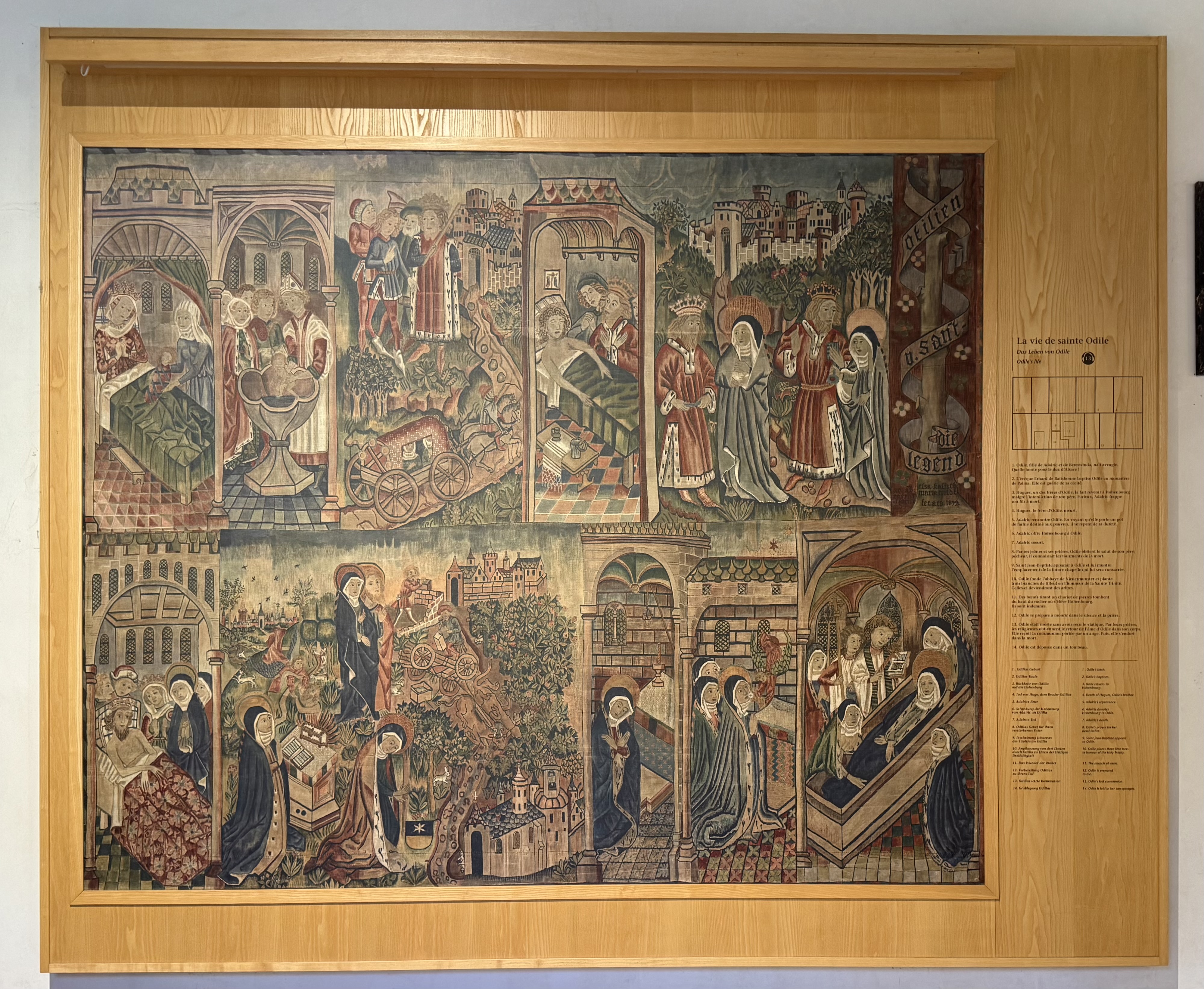 Datant du XIIᵉ siècle, cette stèle résume la fondation du monastère. Sur cette face, le duc d’Alsace Adalric remettant le livre de fondation à sa fille Odile. Sur la face antérieure, l’évêque Saint Léger, qui soutint la construction des bâtiments. Sur l’autre face, les abbesses Herrade et Relindis sous la protection de la Vierge et de l’Enfant. « Approchez-vous du Christ, pierre vivante, rejetée par les hommes, mais choisie par Dieu. »