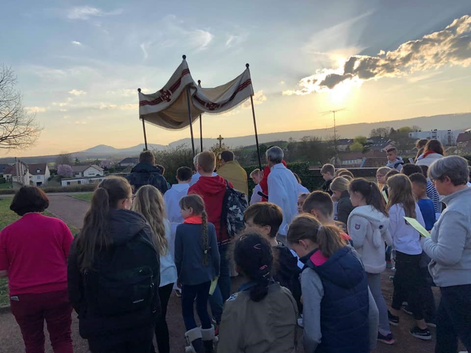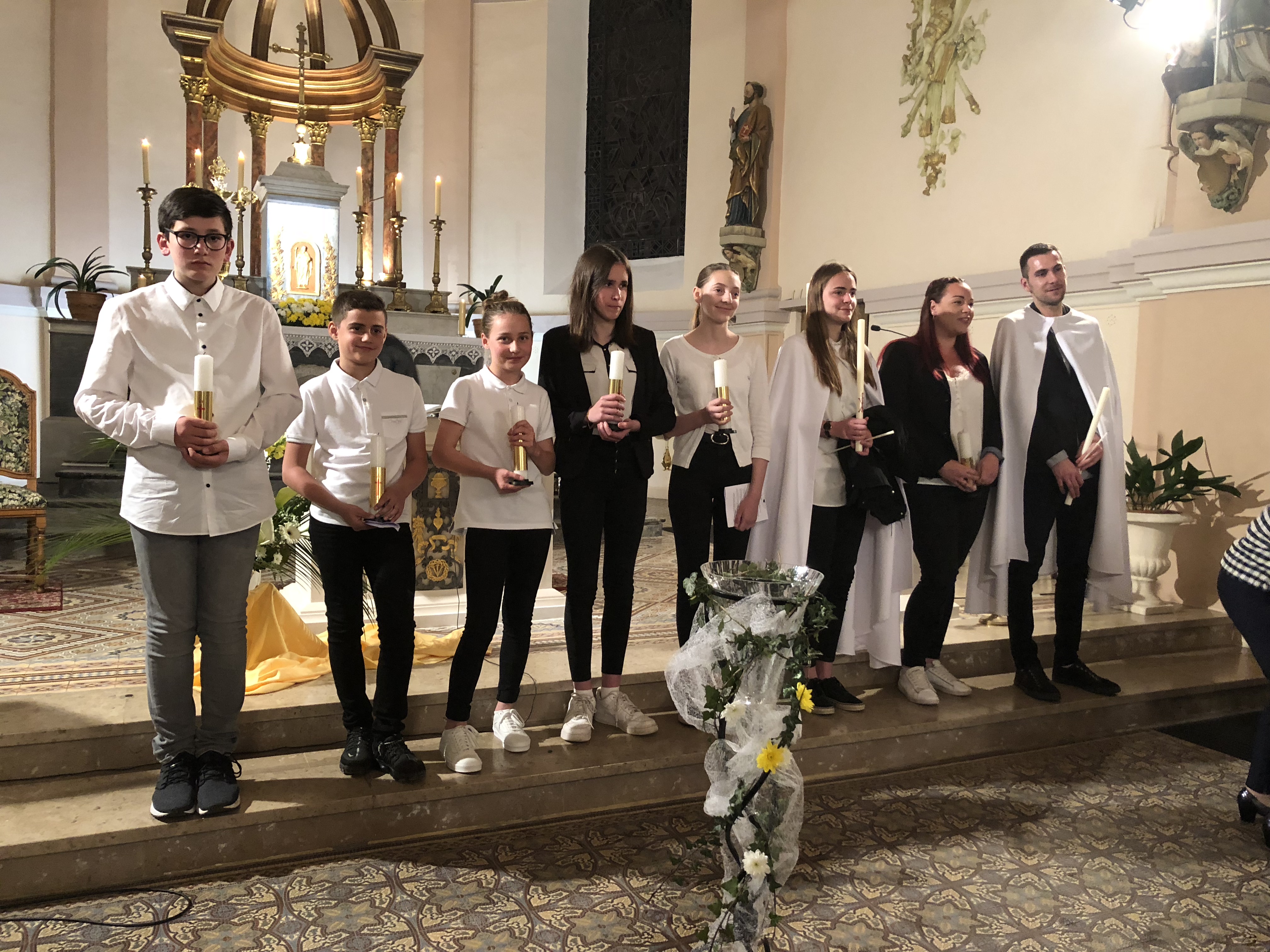 Samedi 20 avril, en l’église Saint Hubert de Waldweistroff, au cours de la veillée pascale, nos confirmands : Aurélien, luka, Elise, Marina et Léa ainsi que nos catéchumènes Valentine et Antony ont prononcé leur profession de foi.