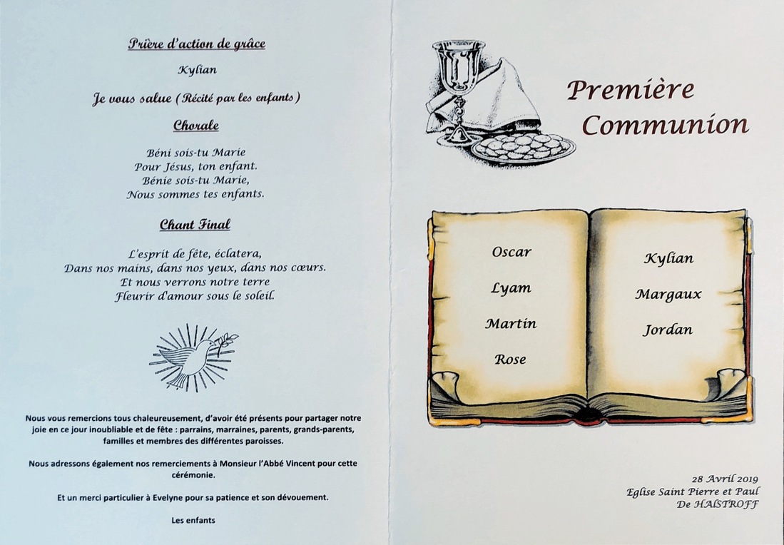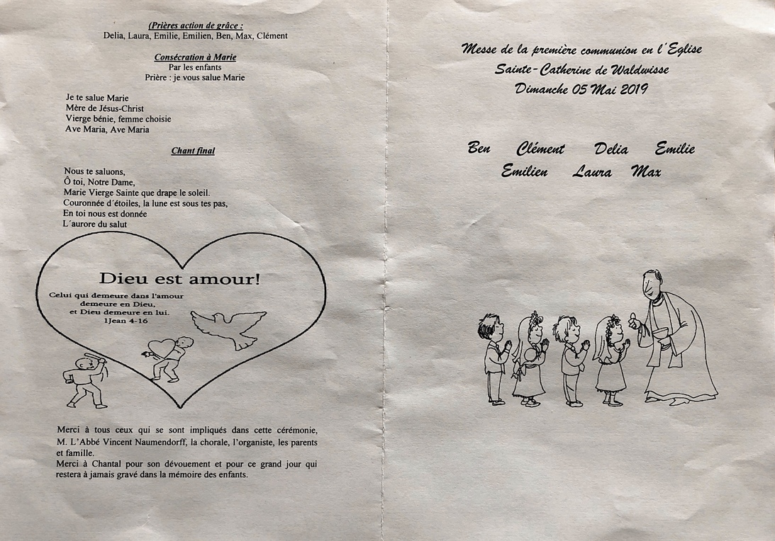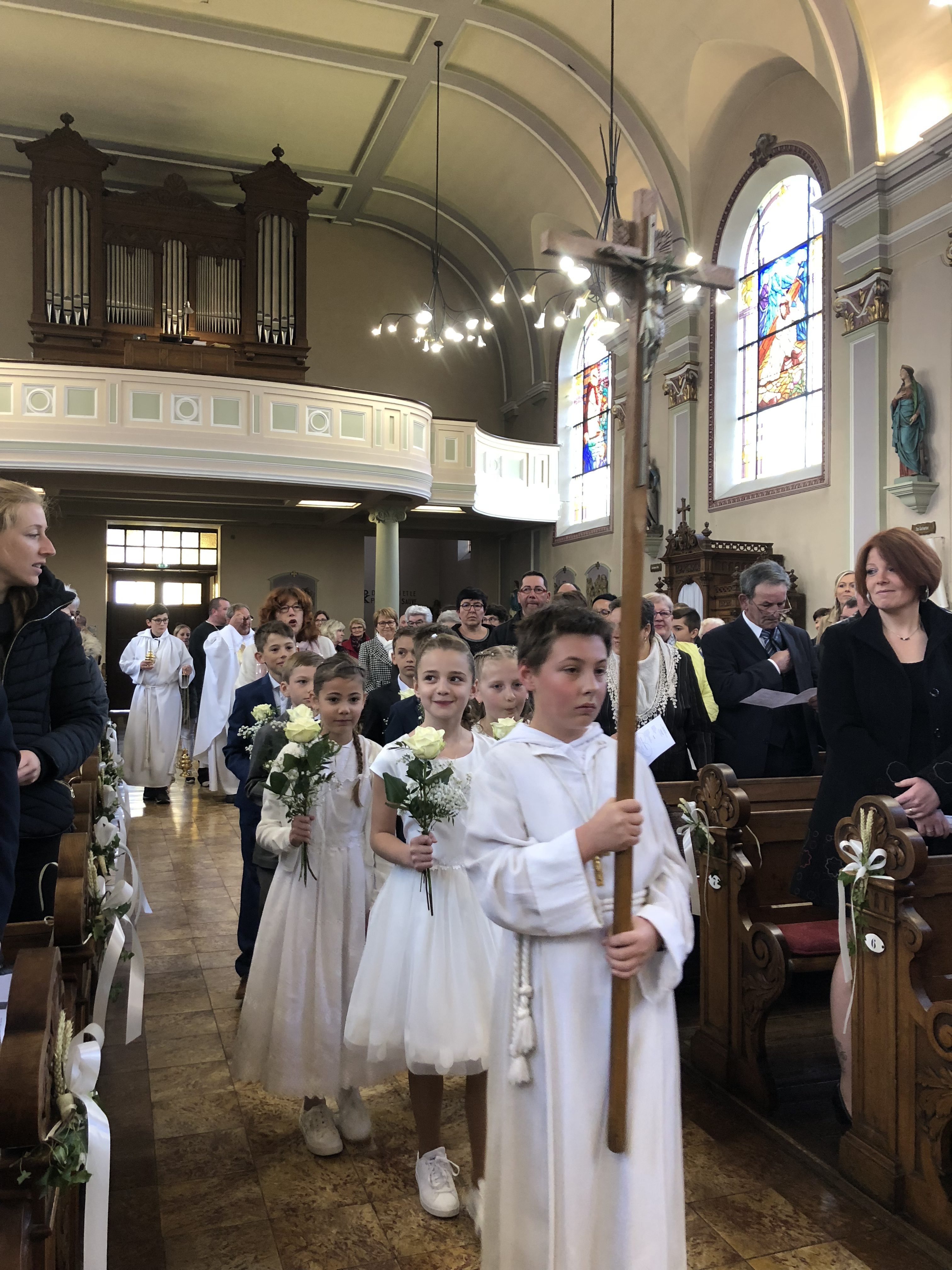 Dimanche 5 mai 2019 en l’église de Waldwisse, 7 enfants de notre communauté de paroisses, ont communié pour la première fois au corps du Christ : Max et Clément de Waldwisse, Delia et Ben de Rémeling, Emilie d’Evendorff, Laura et Emilien de Kirschnaumen.