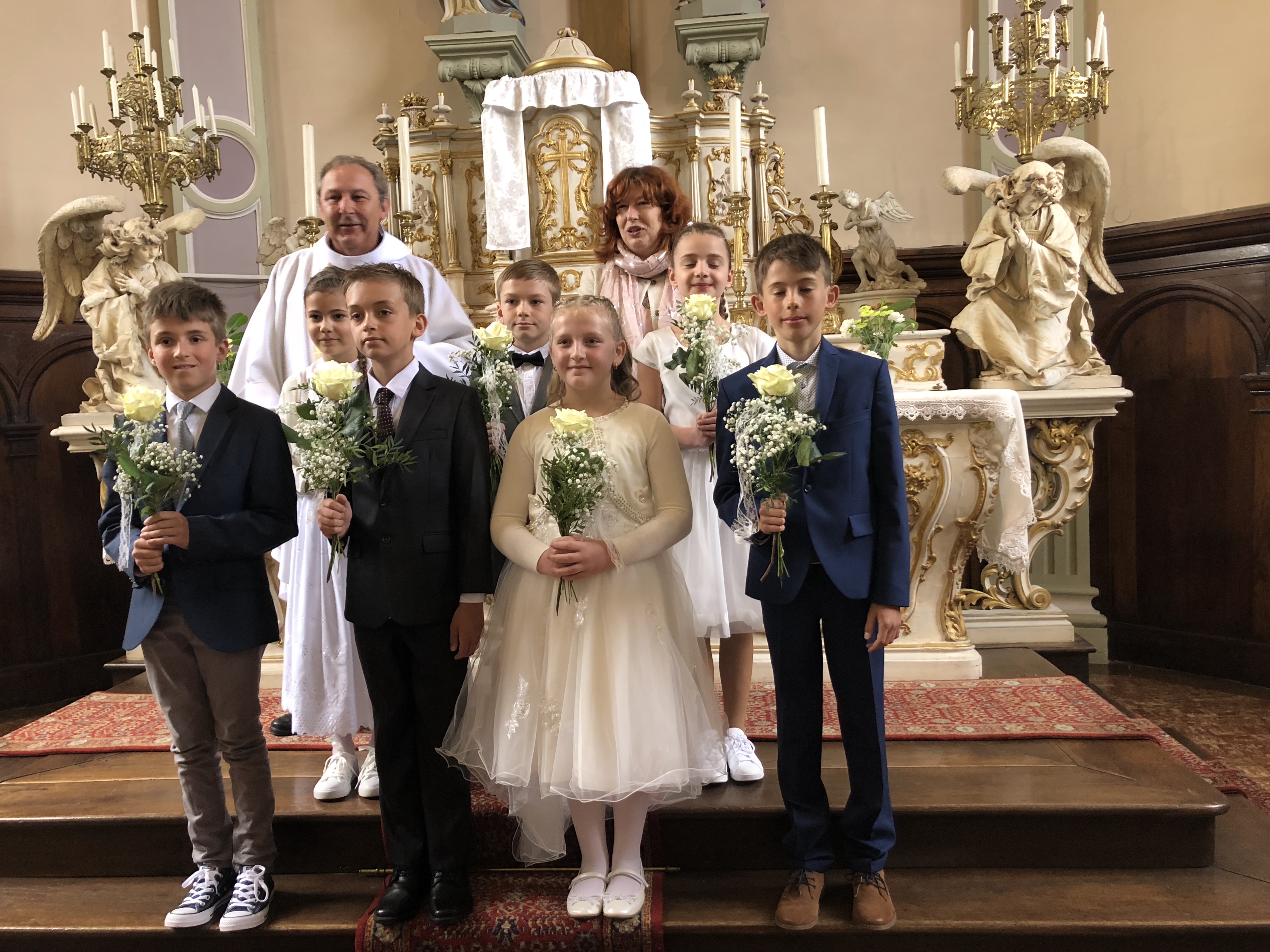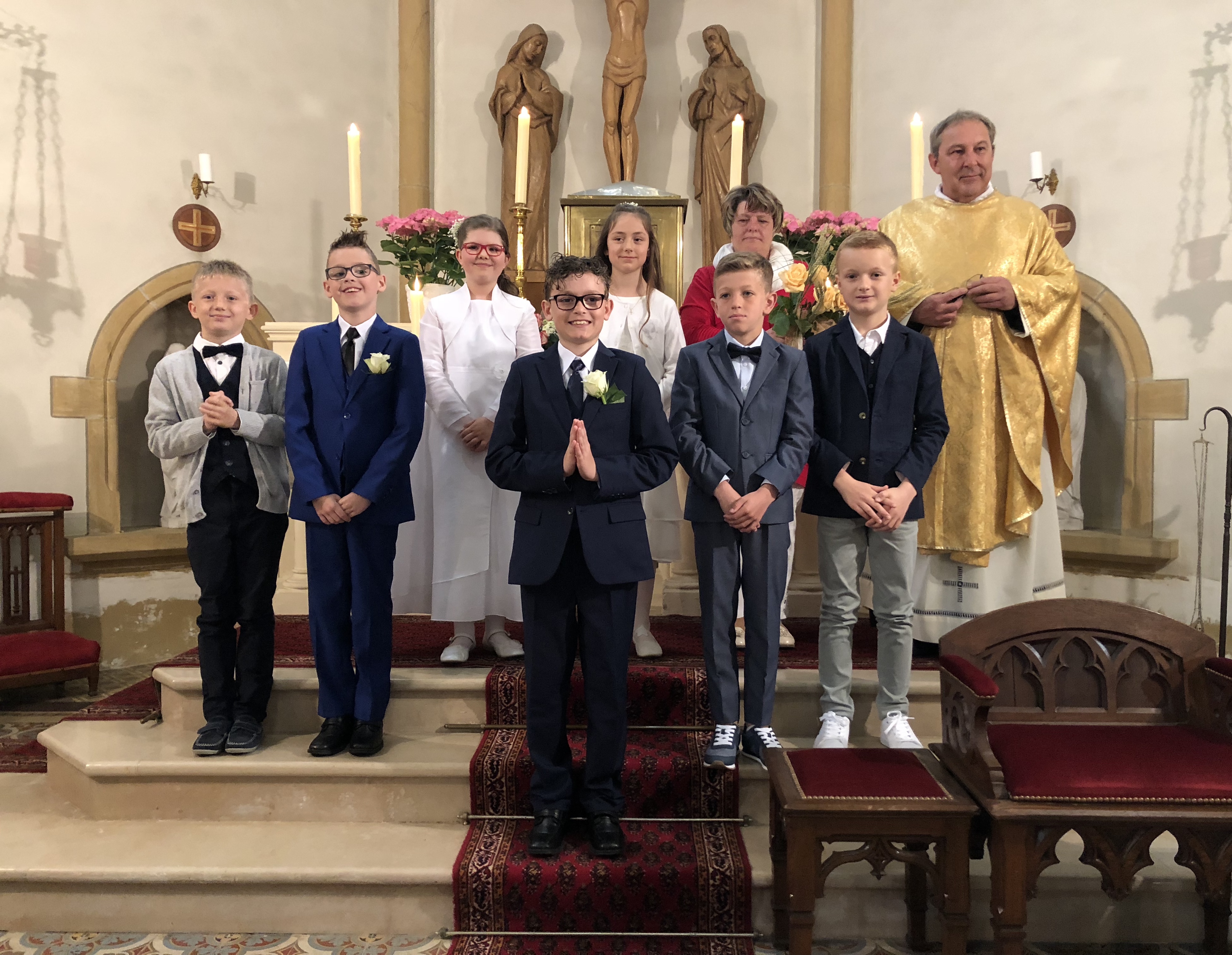 Après quelques mois de préparation avec notre catéchiste Evelyne, Margaux , Rose, Oscar, Lyam, Martin, Jordan et Kylian ont communié pour la première fois au corps du Christ.