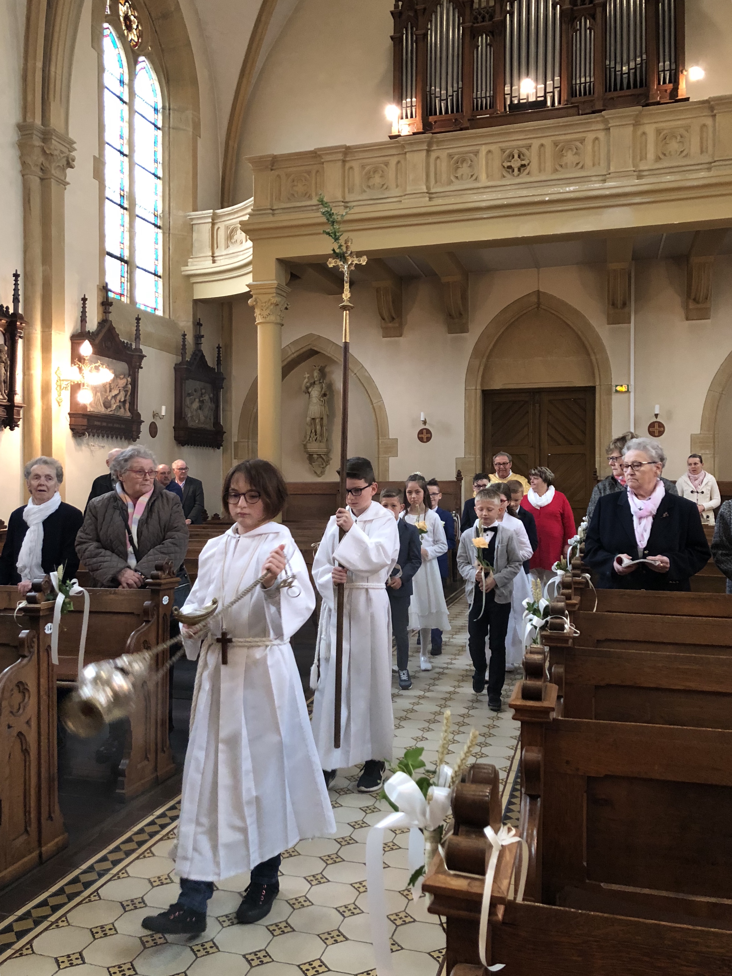 Dimanche 5 mai 2019 en l’église de Waldwisse, 7 enfants de notre communauté de paroisses, ont communié pour la première fois au corps du Christ : Max et Clément de Waldwisse, Delia et Ben de Rémeling, Emilie d’Evendorff, Laura et Emilien de Kirschnaumen.