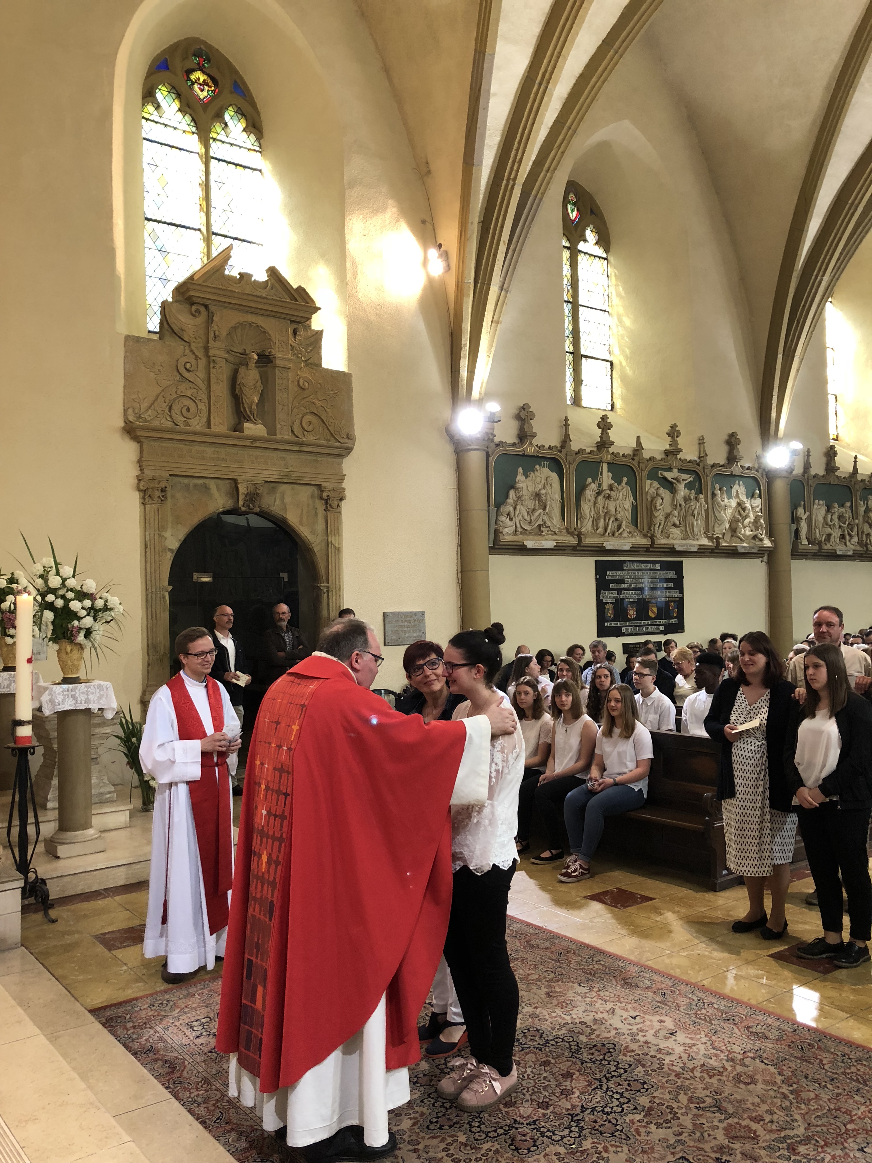 Ce samedi 8 juin, veille de la Pentecôte, l’abbé Jean-Christophe Meyer, vicaire général, a donné le sacrement de la confirmation à 26 jeunes et 6 adultes des communautés de paroisses des Archiprêtré de Sierck et d’Hettange-Grande, lors d’une messe à l’église de Roussy le village,